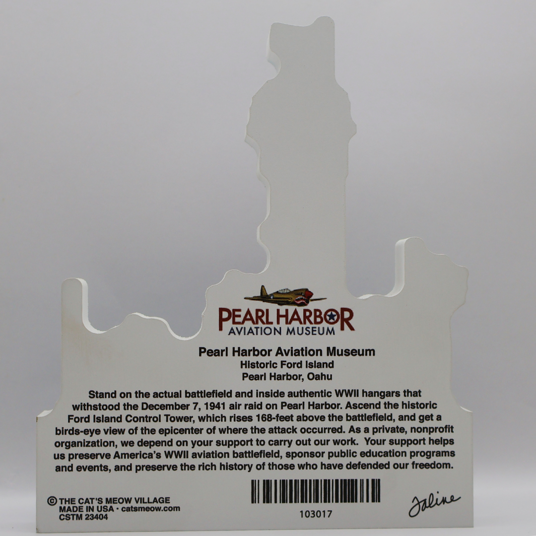 Standing 6.5 inches tall x 5.5 inches wide, order yourself one of these 3/4″ thick wooden figures to add – or start – your Cat’s Meow Village collection. It has a simple paragraph of history & facts to help remind you of your experience visiting “America’s WWII Aviation Battlefield.”