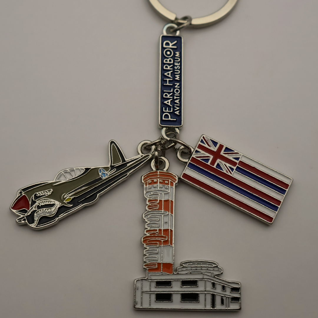 This “charming” keychain is just the ticket! Measuring roughly 5″ in length, it features a drop name plate and from that, an additional three charm figures: the Control Tower, the P-40, and a flag – one side is the USA and the other is Hawaii State flag. Each charm is enameled on BOTH sides and made of shiny, silver toned, durable zinc alloy. Measures roughly 3.5 inches long from the base of the key loop.